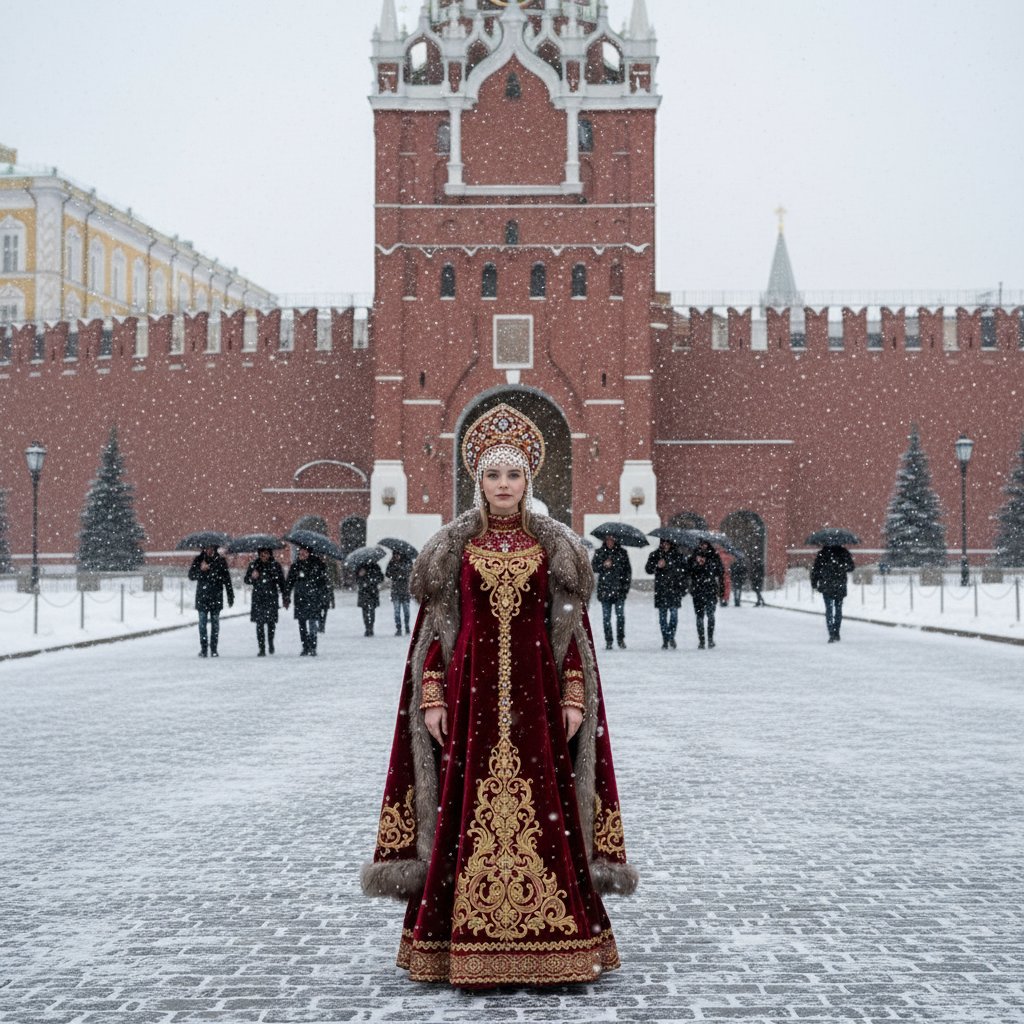 Девушка в старинном русском наряде застыла у массивных ворот Московского Кремля, обильный снегопад, люди с зонтами на фоне