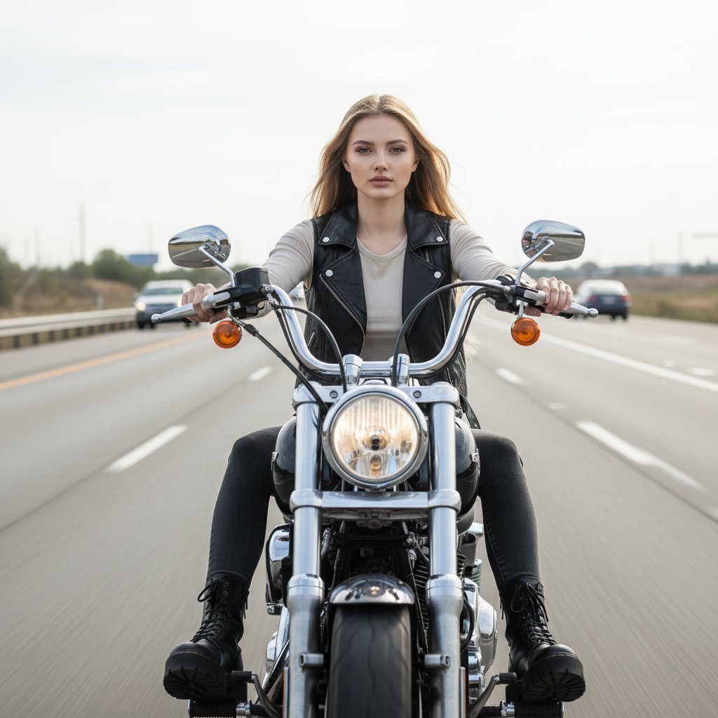 Девушка в черной кожаной жилетке, надетой поверх светлой футболки с длинным рукавом, в темных ботинках на толстой подошве и облегающих джинсах, едет на мотоцикле Harley-Davidson по дневной трассе. Средний план, руки крепко держат руль, прямой уверенный взгляд направлен в объектив, асфальтовая дорога позади размыта.
