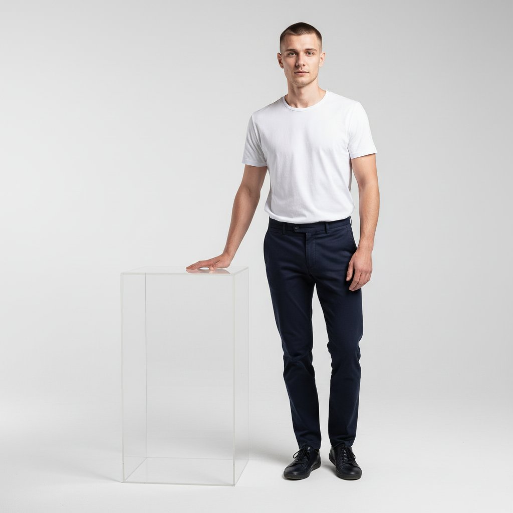 Портрет молодого мужчины в белой футболке и темных брюках, стоящего на циклораме. Он уверенно опирается рукой на высокий прозрачный акриловый куб, взгляд прямой, выражение лица спокойное. Минималистичная студийная съемка.