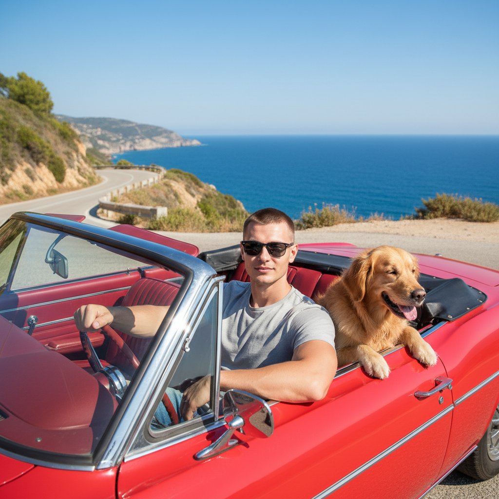 Мужчина в футболке расслабленно сидит за рулем кабриолета. Его верный пес расположился на переднем сиденье, свесив голову наружу, чтобы ощутить ветер. На заднем плане — живописная прибрежная дорога, залитая ярким солнечным светом под безоблачным небом.