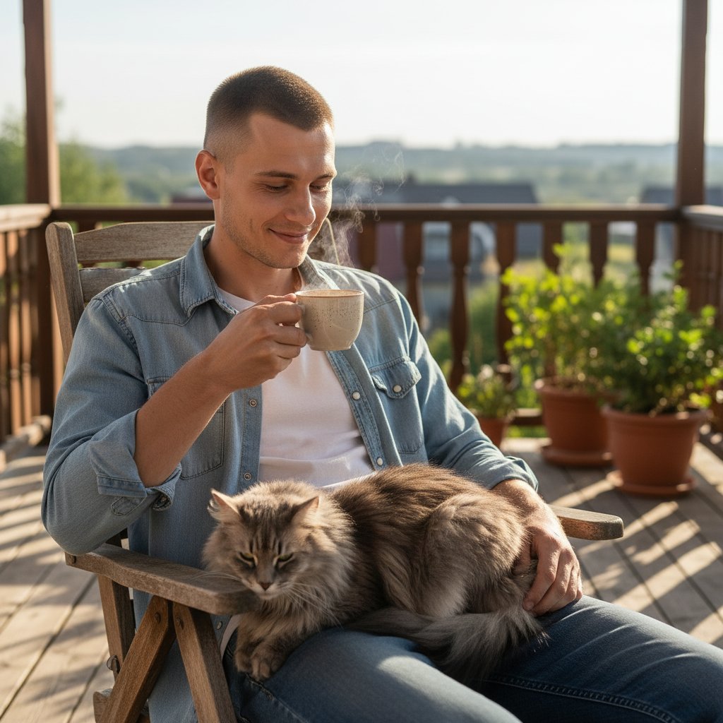 Мужчина в джинсовой рубашке наслаждается кофе на веранде, а на его коленях мурлычет пушистый серый кот.