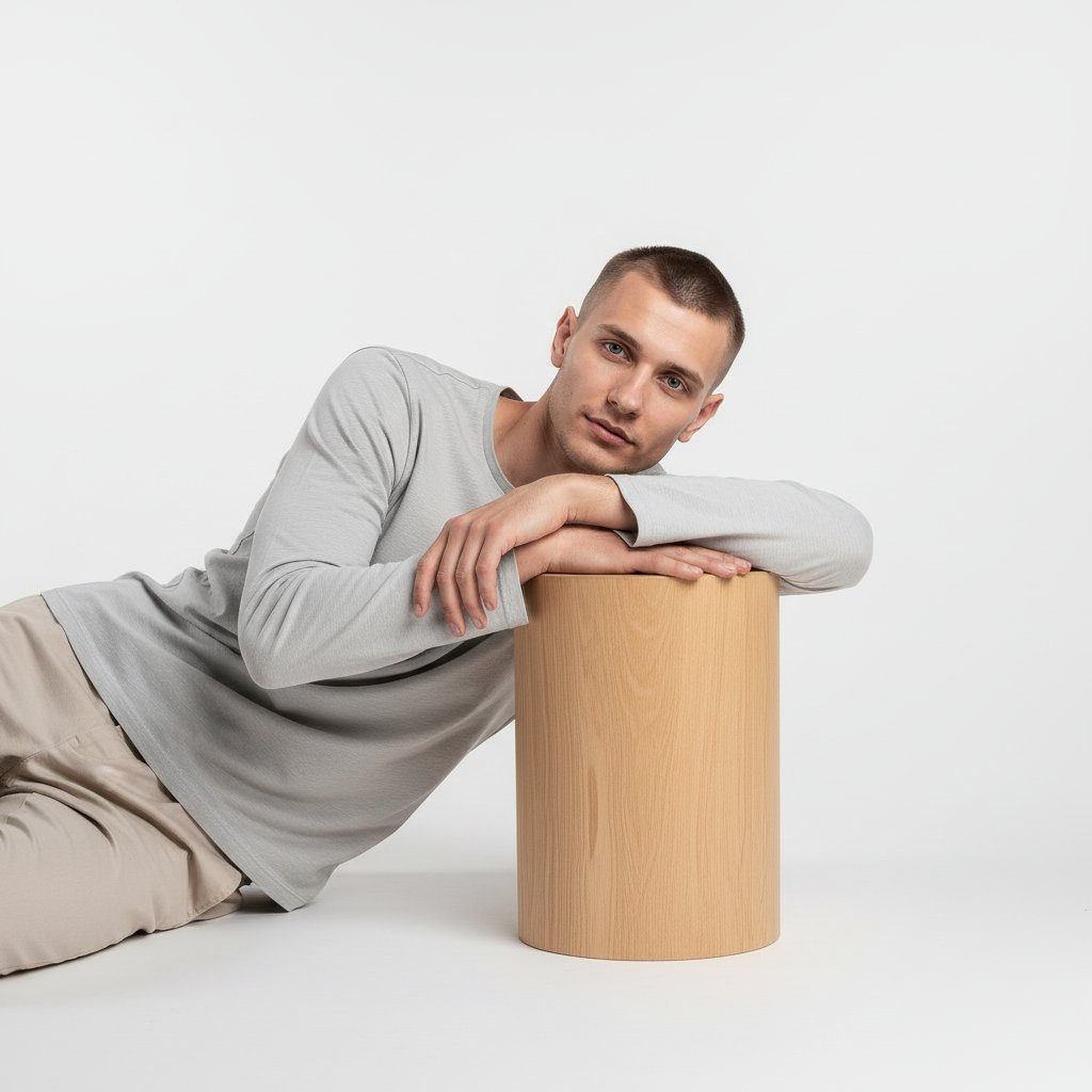 Мужчина в простой светлой рубашке полулежит, опираясь на минималистичный деревянный цилиндр. Он смотрит в камеру, руки расслабленно покоятся на цилиндре. Фотография в стиле чистого мужского минимализма, снятая на белой циклораме.