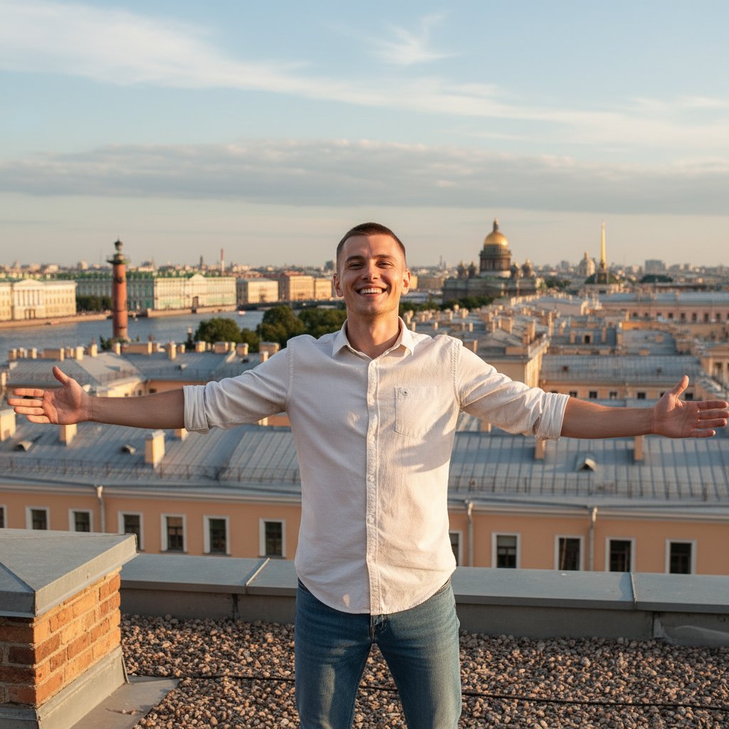 Мужчина в светлой рубашке и джинсах стоит на крыше петербургского дома, раскинув руки в стороны. На заднем плане — панорама Стрелки Васильевского острова. Он смотрит в камеру с улыбкой. Снимок крупным планом, передающий ощущение свободы и простора.