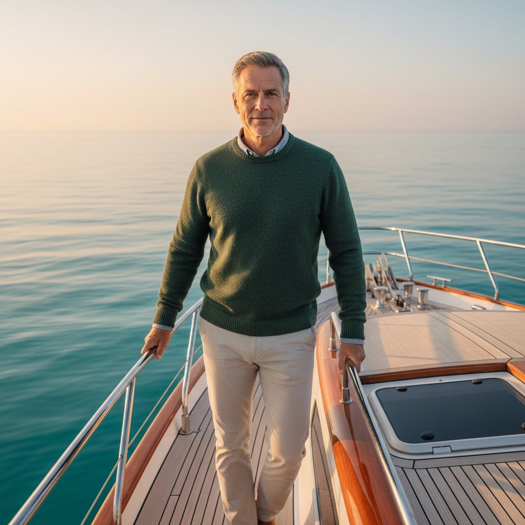Мужчина в возрасте 50-60 лет, одетый в темно-зеленый свитер из шерсти и светлые брюки из хлопка, стоит на палубе элегантной моторной яхты. Одна рука покоится на перилах, взгляд направлен в объектив. Средний план, вокруг спокойная водная гладь, мягкое утреннее освещение, создающее атмосферу приключения.