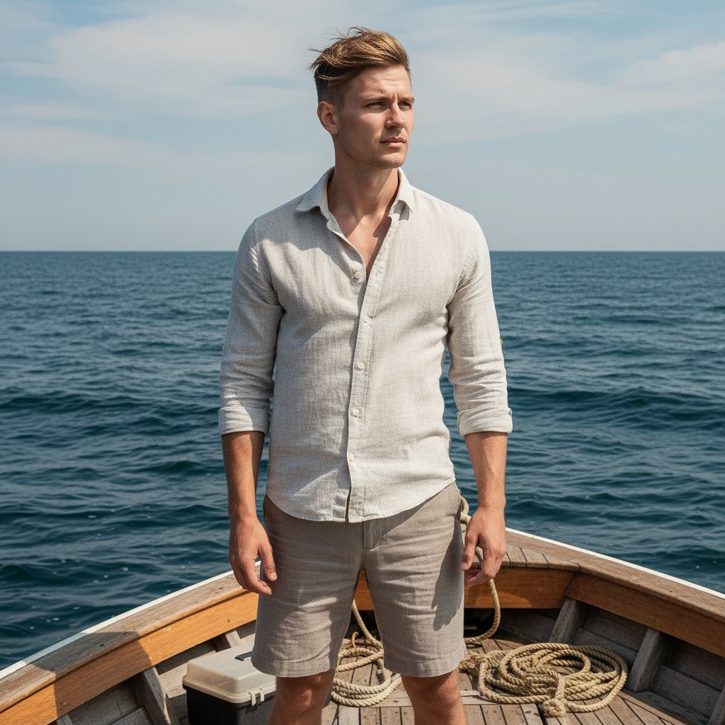 Мужчина в светлой льняной рубашке и шортах стоит на передней части рыболовной лодки, глядя вдаль на море. Ветер растрепал его волосы, а на заднем плане — необъятный морской простор. Кадр крупным планом, передающий дух свободы и приключений.