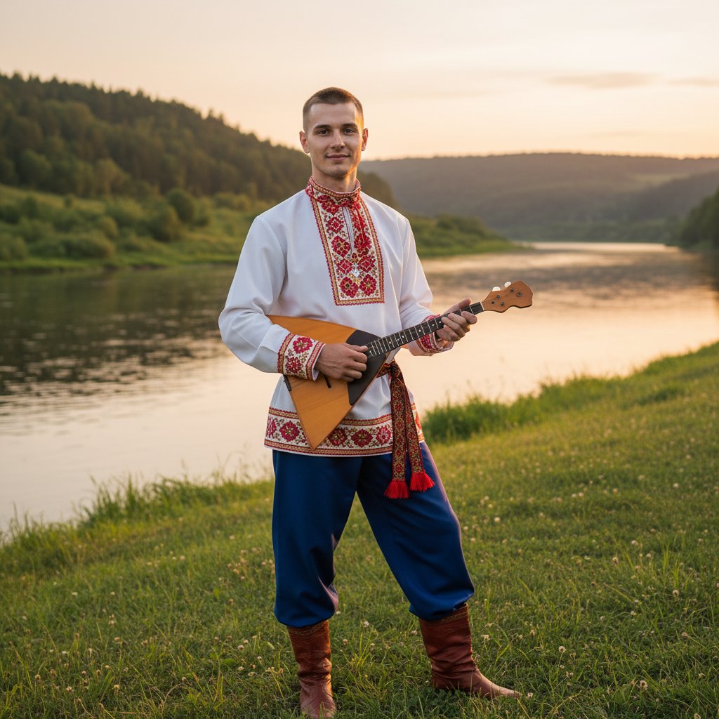 Мужчина в традиционном русском костюме, с вышитой рубахой и свободными штанами, стоит на берегу живописной реки. Зелёные холмы виднеются на заднем плане. Он держит в руках балалайку, а его взгляд с лёгкой улыбкой направлен на зрителя. Мягкое, естественное освещение подчёркивает черты лица и детали костюма.