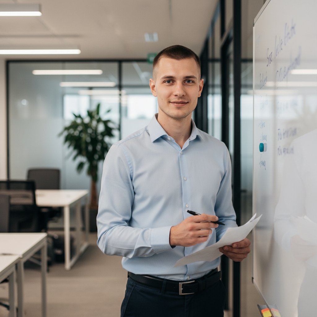 Мужчина в голубой рубашке и темных брюках стоит у офисной доски. В руках он держит документ и ручку. Взгляд направлен в камеру, на лице легкая улыбка. На заднем плане — современная офисная мебель и стеклянные стены. Крупный план, создающий атмосферу уюта и продуктивности.