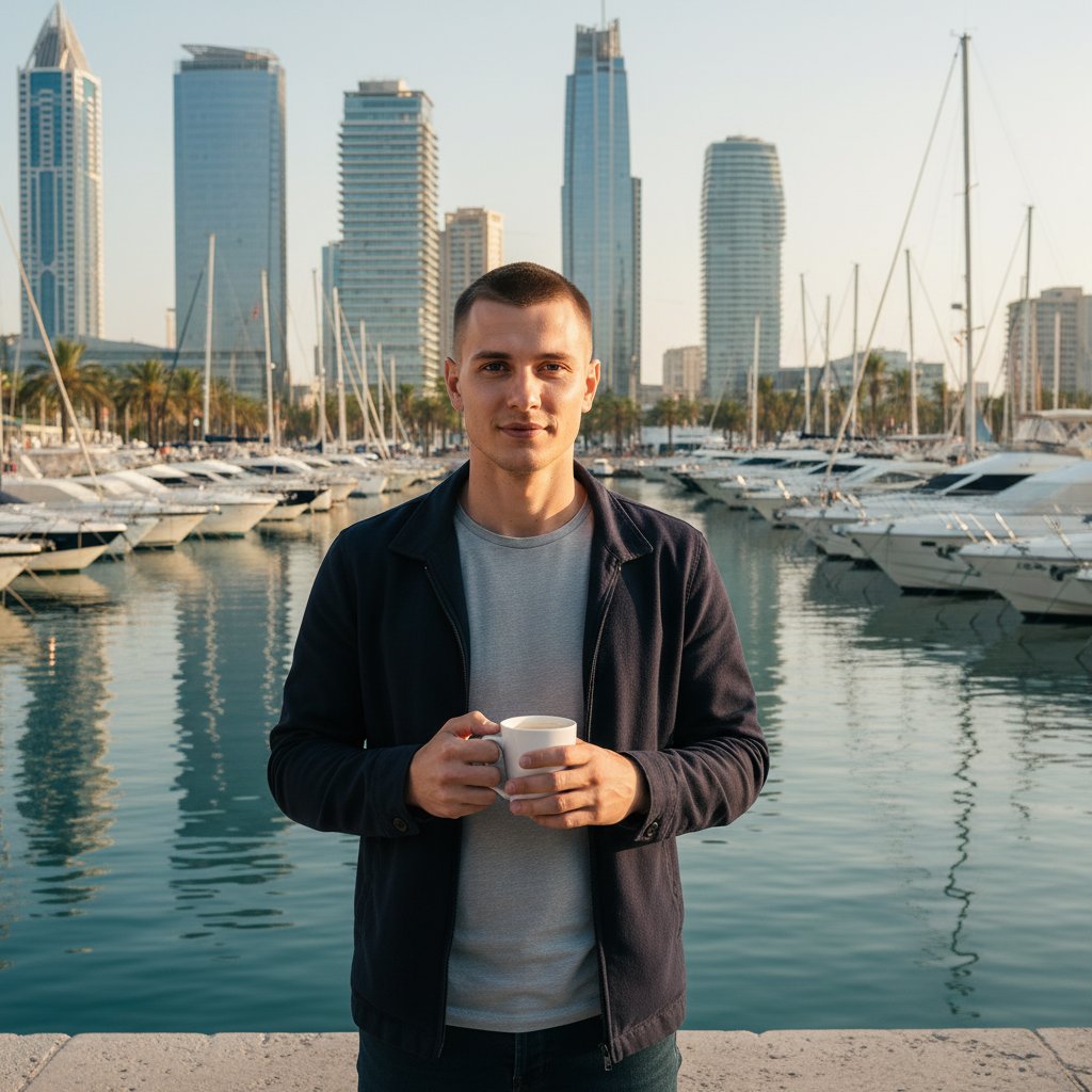Мужчина держит чашку кофе, стоит на набережной, глядя в объектив. На заднем плане — живописная гавань с яхтами и высотные здания.