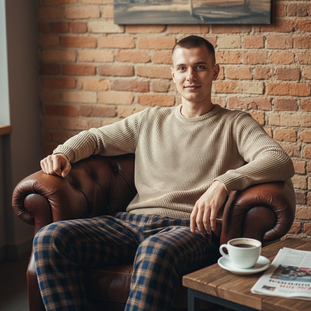 Молодой человек в бежевом свитере и клетчатых брюках расслабленно сидит в кожаном кресле у кирпичной кладки в кафе. На столике перед ним стоит чашка кофе и лежит газета. Он смотрит в объектив с легкой улыбкой, передавая атмосферу умиротворения. Снято на среднем плане.