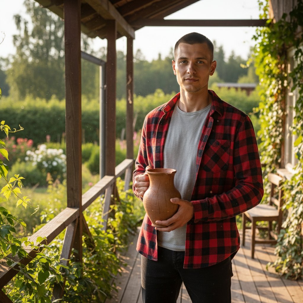 Мужчина в клетчатой рубашке и темных брюках стоит на залитой солнцем веранде дачного дома, держа в руках глиняный кувшин с водой. Он смотрит прямо в камеру с выжидательным выражением лица. Вокруг царит атмосфера природной тишины и простоты.