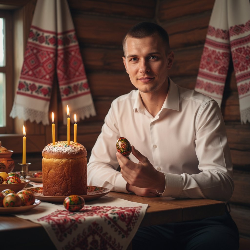 Мужчина в светлой рубашке и темных штанах сидит за накрытым столом, на котором стоит кулич и горят свечи. Он держит в руке расписное яйцо, его взгляд направлен в объектив с легкой улыбкой. На заднем плане видны бревенчатые стены русской избы, украшенные традиционными рушниками. Крупный план, передающий атмосферу домашнего торжества.