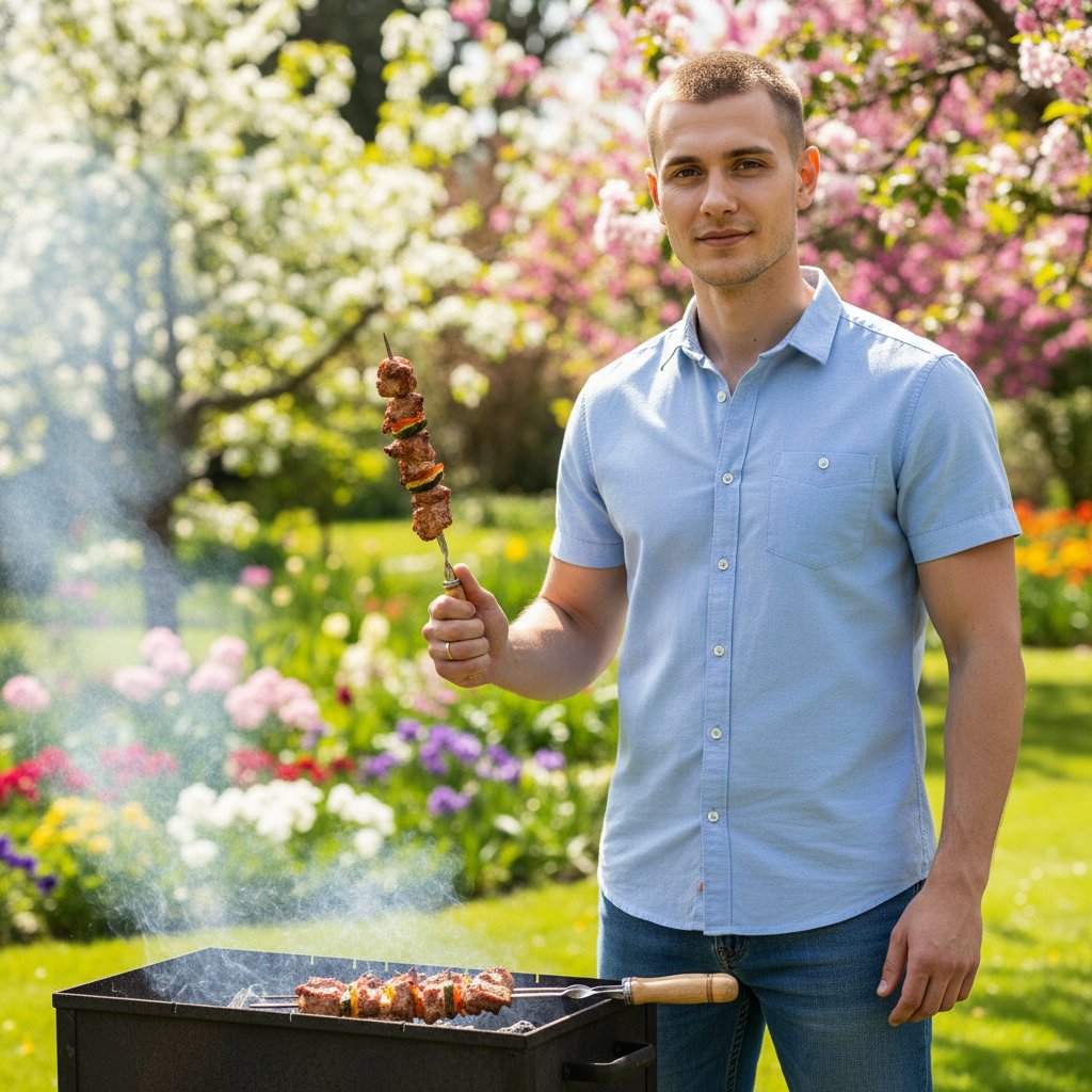 Фото мужчины в светлой рубашке и джинсах, стоящего у мангала с шампуром готового шашлыка в руке. Он смотрит в камеру. На заднем плане — цветущий сад. Крупный план, передающий атмосферу весеннего отдыха.