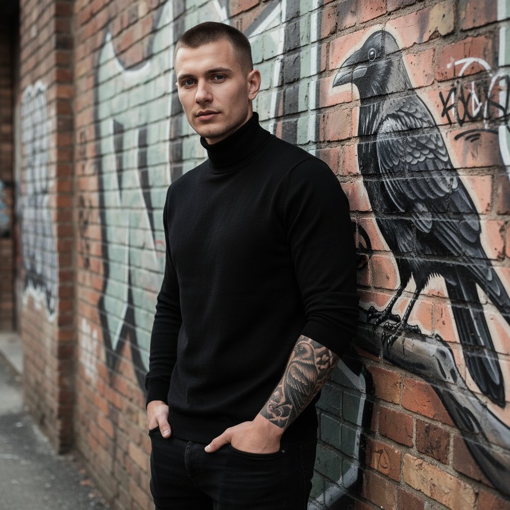Мужчина в черном гольфе у стены с граффити, руки в карманах, на предплечье видна татуировка ворона. Естественное освещение, подчеркивающее уличный стиль.