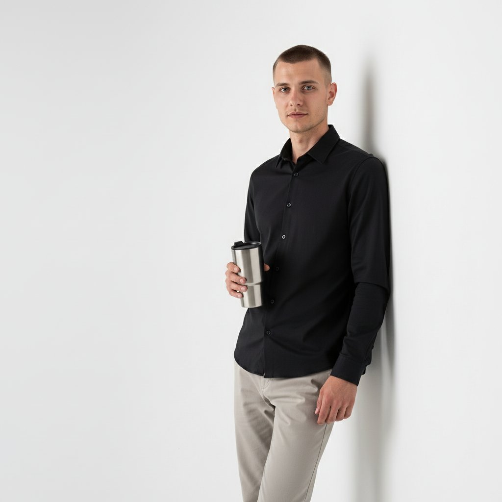 Мужчина в темной однотонной рубашке и светлых брюках позирует на циклораме, прислонившись плечом к гладкой белой стене. В его руке — простая металлическая термокружка. Он смотрит прямо в объектив, его поза расслабленная, а общая атмосфера — спокойная.