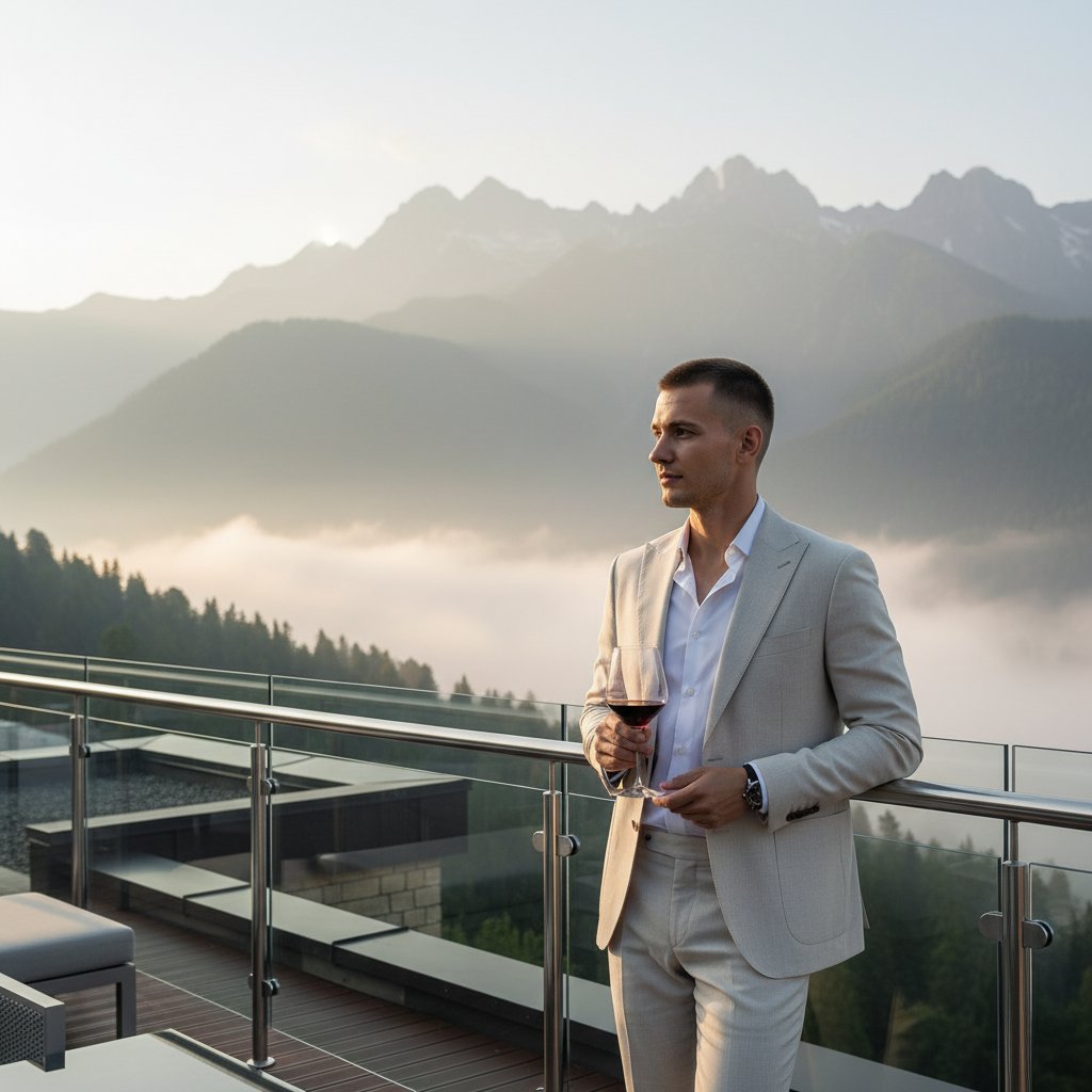 Мужчина в светлом костюме, без галстука, стоит на террасе с панорамным видом на горы Красной Поляны. Обопрившись руками на перила, он держит бокал с вином. Утренний туман окутывает склоны позади него. Крупный план, создающий атмосферу роскоши горного курорта.
