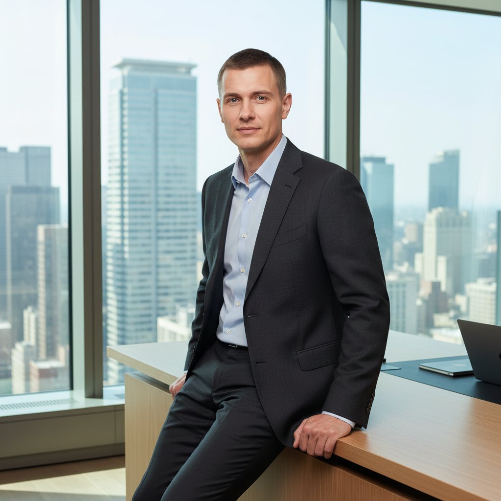 Мужчина средних лет в строгом темно-сером костюме и светлой рубашке, без галстука и украшений, сидит боком на краю рабочего стола у панорамного окна в современном офисе небоскреба. Его руки свободно покоятся на столешнице. Он смотрит прямо в объектив. Снято со среднего плана в стиле минимализма.
