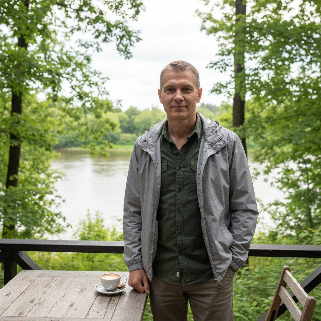 Мужчина средних лет (50-60) в серой ветровке с капюшоном, темно-зеленой рубашке и прямых брюках стоит у деревянного столика на веранде кафе с видом на реку. Он смотрит в камеру. Средний план. Вокруг зелень деревьев. Мягкий дневной свет.
