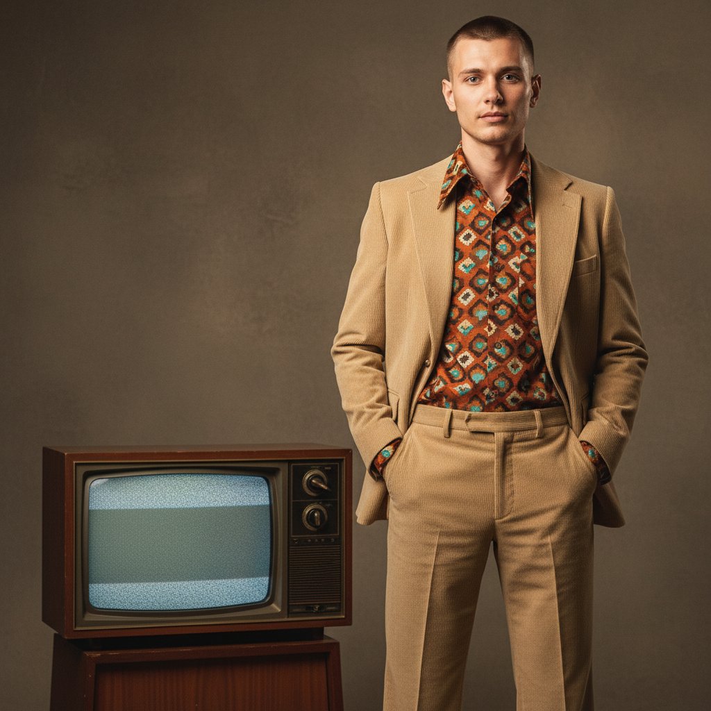 Мужчина в костюме из бежевого вельвета, брюки клёш, рубашка с ярким геометрическим узором, стоит у старинного телевизора, руки в карманах. Средний план, прямой взгляд в объектив, мягкое винтажное освещение.