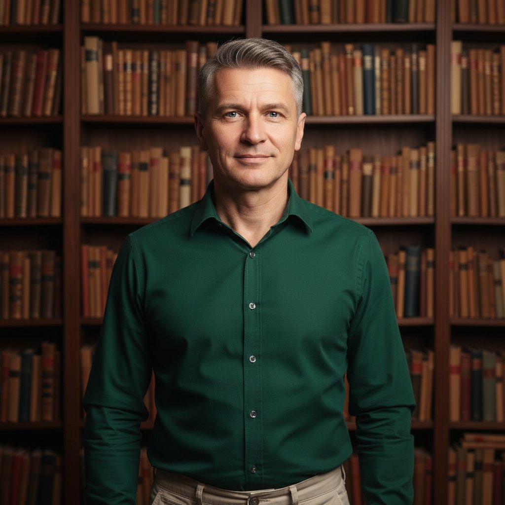 Мужчина в возрасте 50-60 лет, одетый в классическую темно-зеленую рубашку с длинным рукавом и светло-бежевые брюки, стоит на фоне старинной книжной полки. Снято со среднего плана, взгляд направлен в камеру с едва заметной улыбкой. Освещение мягкое, общая атмосфера спокойная.