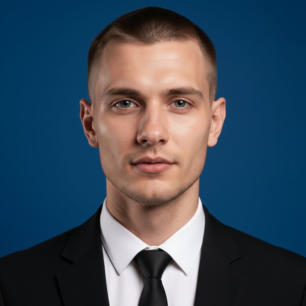 Портрет мужчины, одетого в черный пиджак, белую рубашку и темный галстук. Он смотрит прямо в объектив на фоне насыщенного синего цвета.