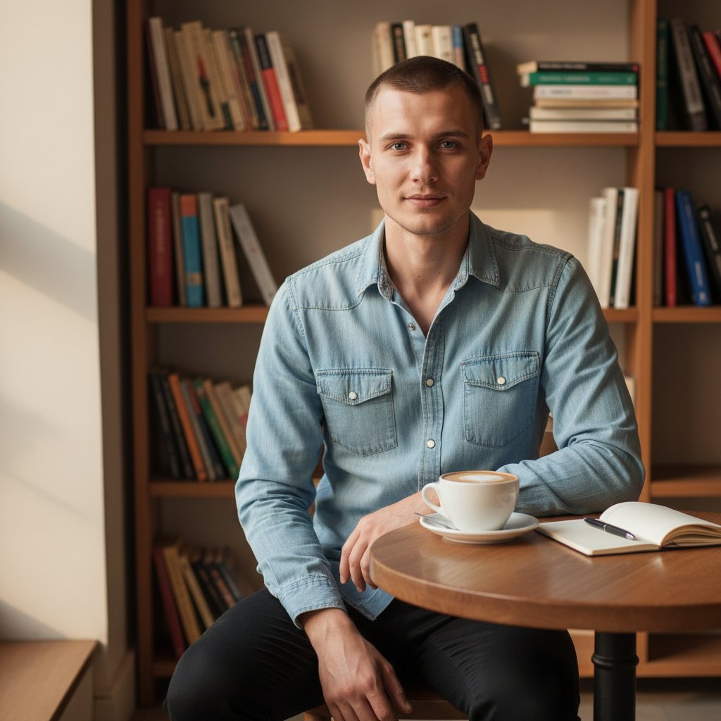 Мужчина в светло-голубой джинсовой рубашке и черных брюках сидит за столиком у стены с книгами в теплой кофейне. Перед ним чашка капучино и блокнот. Он смотрит в камеру с легкой улыбкой. Мягкий дневной свет, средний план.