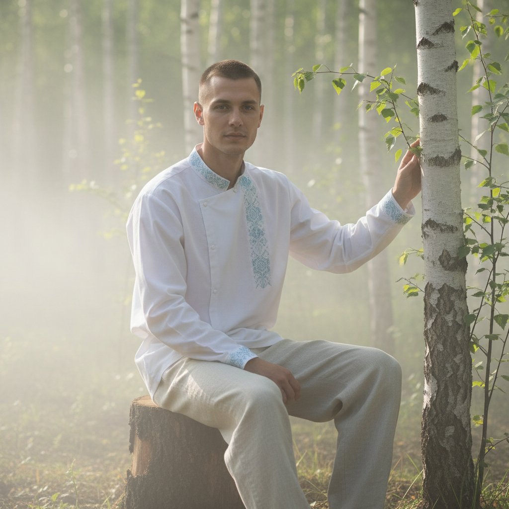Молодой мужчина в белоснежной косоворотке с нежной голубой вышивкой, светлые льняные брюки, без головного убора, сидит на пне в окружении берез, одна рука касается ветки, уверенный взгляд в объектив, минималистичный стиль, легкий утренний туман.