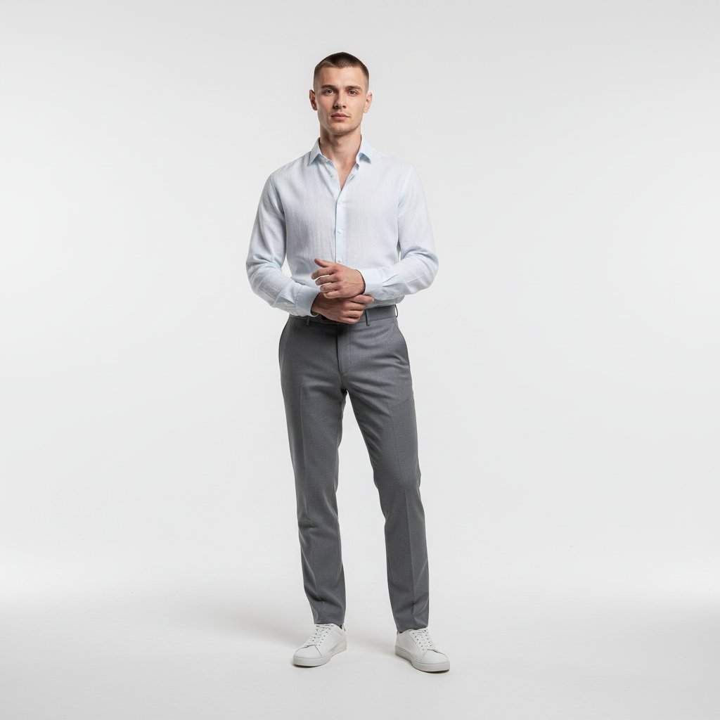 Портрет мужчины в студии, стоящего перед белой циклорамой. Он одет в светлую льняную рубашку, серые классические брюки и белые кеды. Руки расслабленно скрещены перед собой, поза открытая, взгляд прямой и уверенный, направленный в объектив. Мягкое, рассеянное освещение подчеркивает минималистичность пространства.