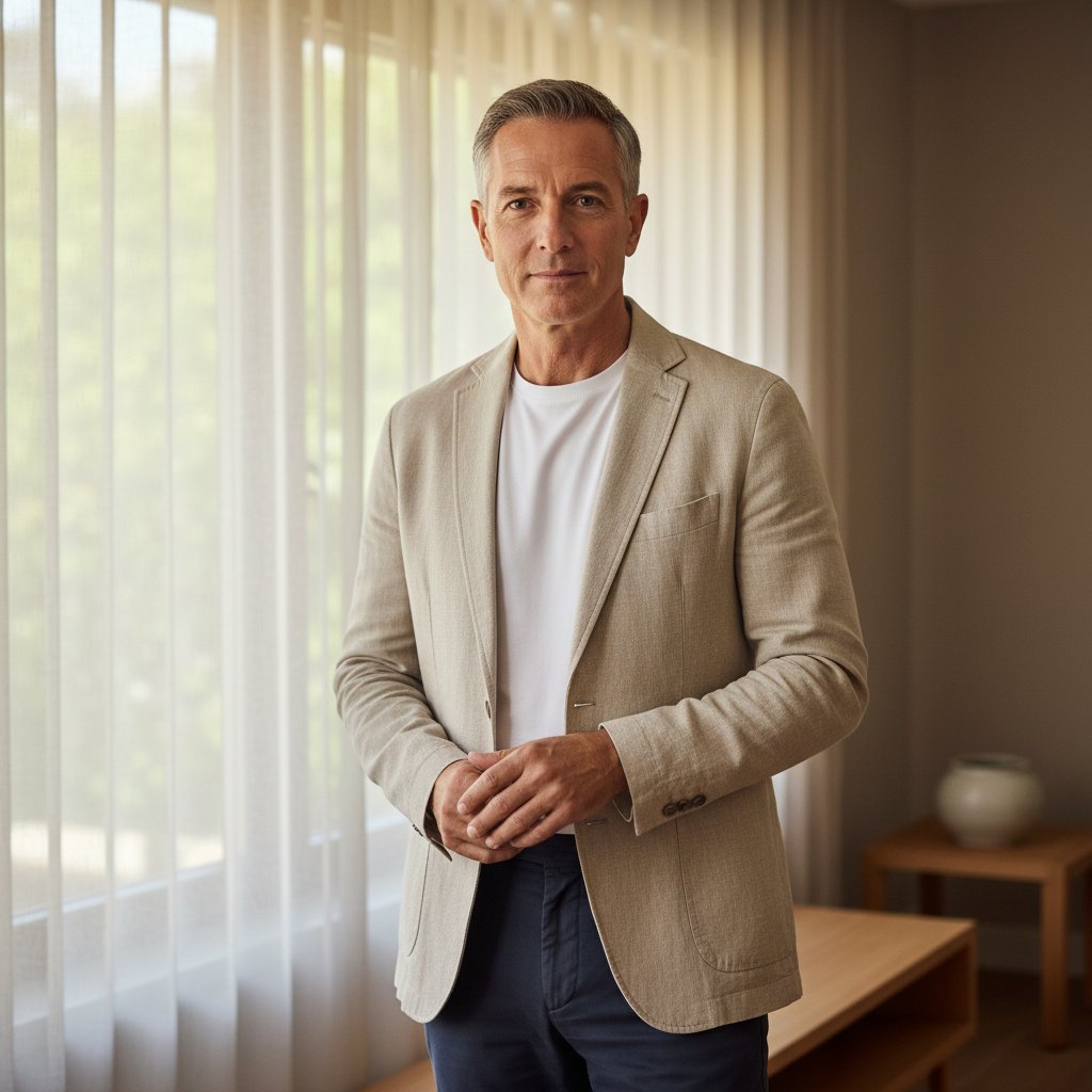Мужчина в возрасте 50-60 лет, одетый в бежевый льняной пиджак, белую футболку и темные брюки, стоит на среднем плане перед окном с легкими шторами. Он смотрит прямо в камеру. Освещение мягкое и естественное, создающее уютную атмосферу современного интерьера.