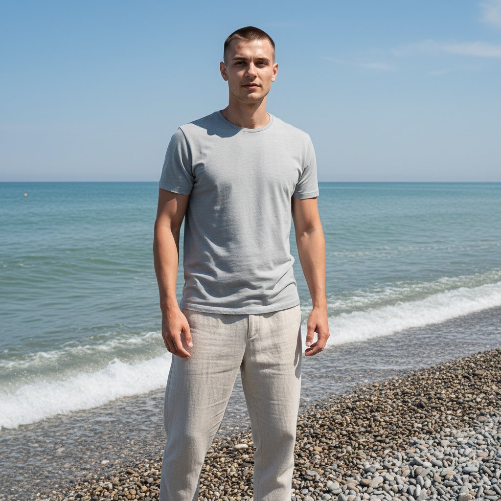 Мужская фигура в серой футболке и свободных светло-бежевых льняных брюках стоит на пляже, усыпанном морской галькой. Взгляд уверенно направлен в объектив. Легкий морской ветерок развевает ткань одежды. На заднем плане видны прозрачные морские волны и ясное голубое небо. Снято со среднего расстояния.