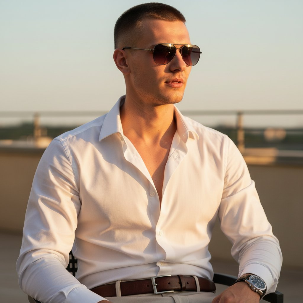 Крупный план портрета мужчины. На нем белая рубашка и элегантные бежевые брюки. Стильные темные очки-авиаторы дополняют образ, как и кожаный ремень. На руке видны дорогие часы. Лицо освещено теплым солнечным светом, создавая мягкие тени.