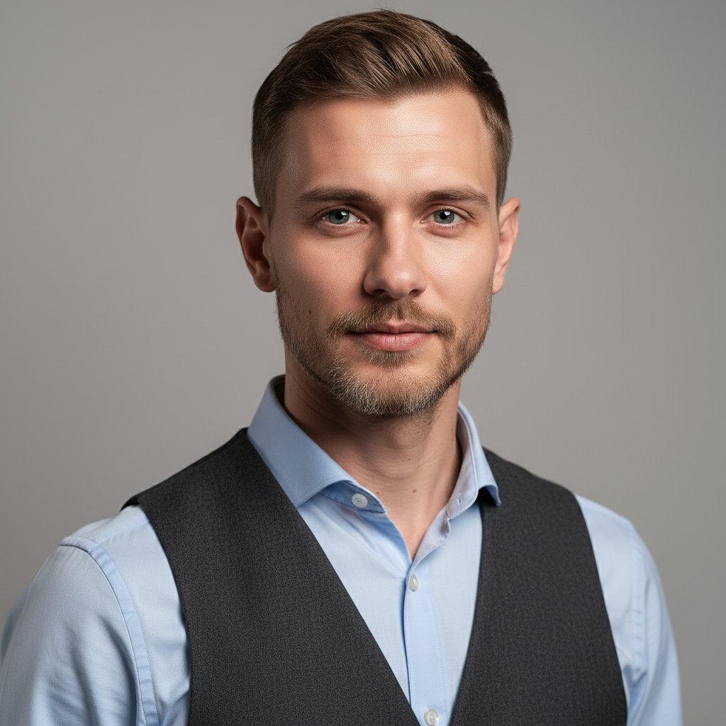 Портрет мужчины средних лет, с легкой щетиной и модной прической, одет в рубашку и жилет. Крупный план лица и плеч. Мягкий естественный свет из большого офисного окна. Уверенный взгляд прямо в камеру, деловое выражение лица.