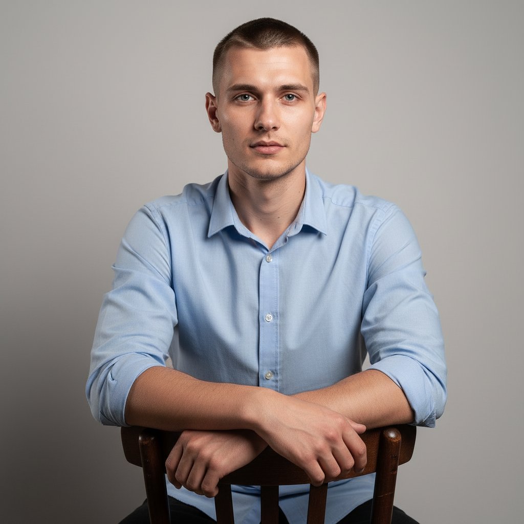 Мужчина в рубашке с подвернутыми рукавами, сидящий на стуле. За ним — серый фон с мягкими градиентными переходами. Акцент на лице.