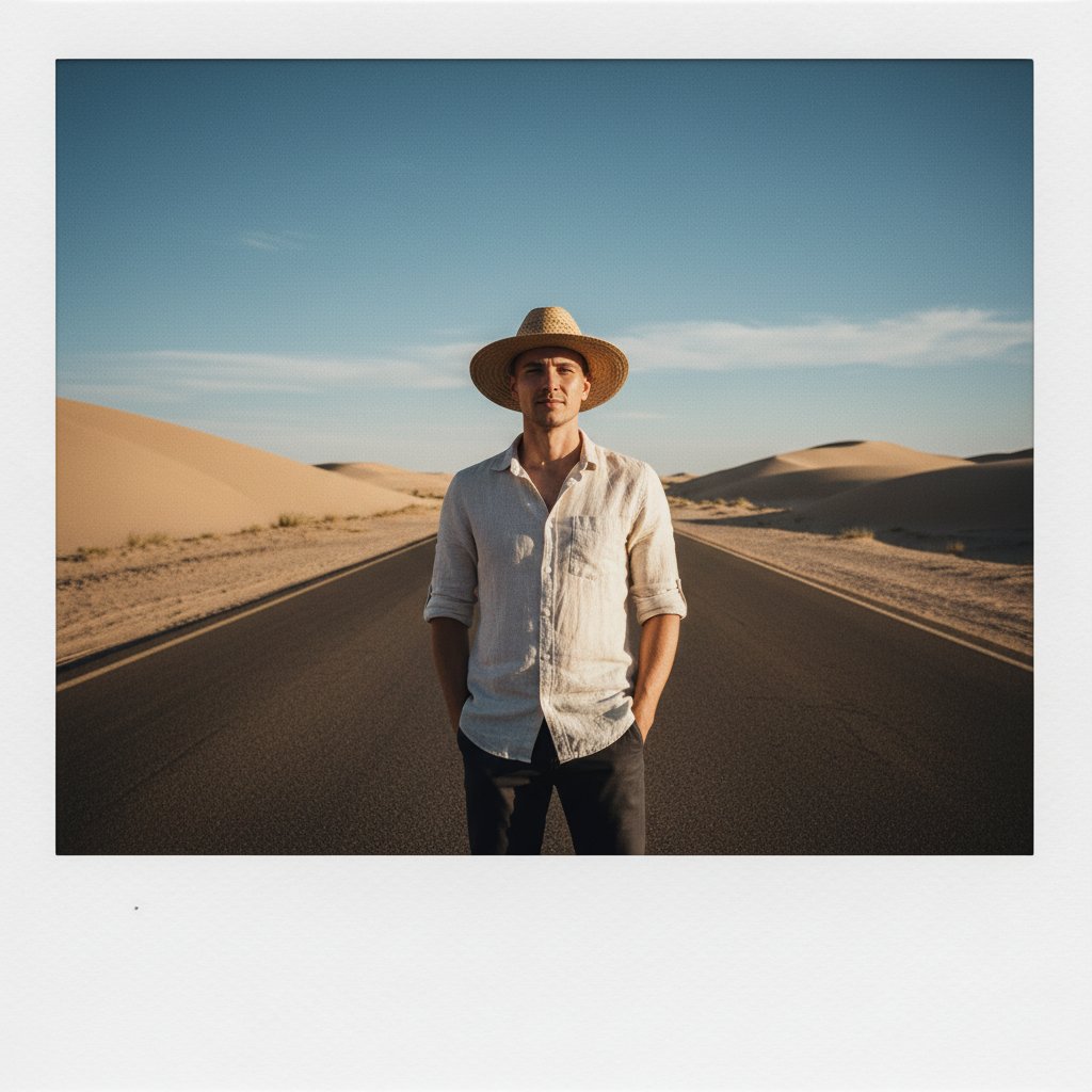 Снимок в стиле Polaroid: мужчина в шляпе и рубашке с подвернутыми рукавами позирует на пустынной дороге, окруженной песчаными дюнами под ярким солнцем.