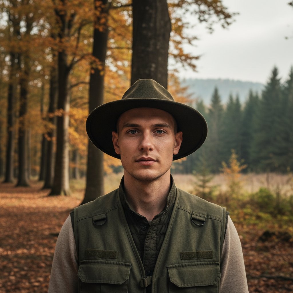 Мужчина в жилетке и широкополой шляпе, расположенный на фоне деревьев