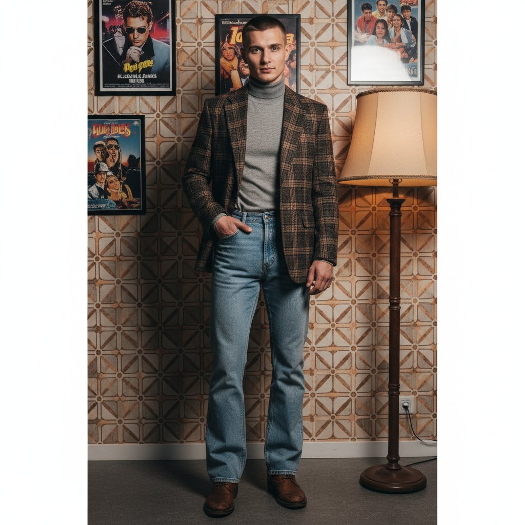 Стильный мужчина в клетчатом пиджаке, расклешенных джинсах и водолазке, позирует на среднем плане перед фоном с ретро-плакатами 80-х. Он смотрит прямо в камеру. На заднем плане видны старинная лампа и винтажные обои. Мягкое, естественное освещение.