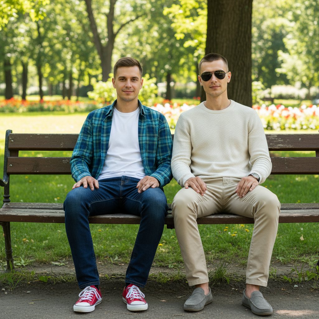 Двое мужчин сидят на скамейке в летнем парке, смотрят в объектив. Первый одет в клетчатую рубашку, темные джинсы и красные кеды. Второй — в светлый свитер, бежевые брюки и серые мокасины, на нем солнцезащитные очки.