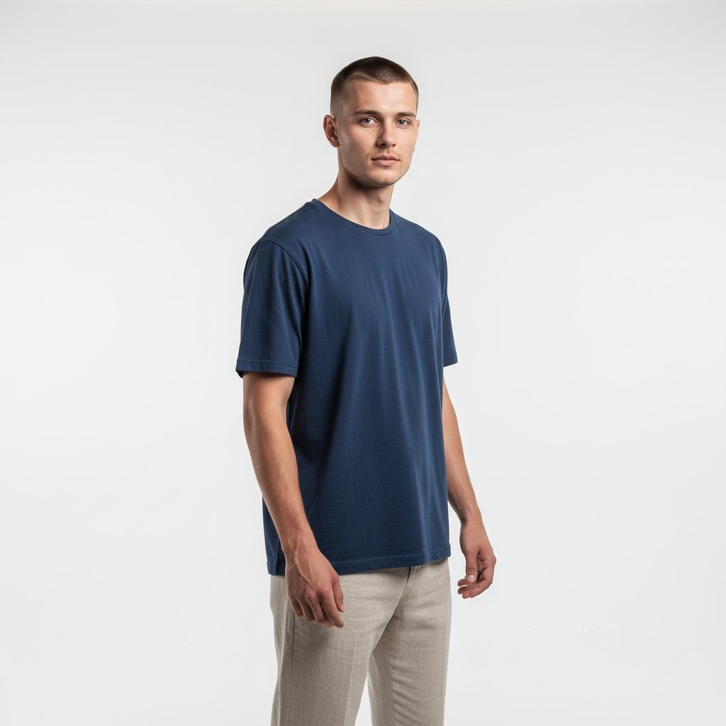 Молодой человек в студии с белой циклорамой, одет в свободную темно-синюю футболку и светлые брюки прямого кроя. Он стоит, руки свободно опущены, корпус слегка развернут, взгляд направлен в объектив. Пространство вокруг пустое, освещение мягкое и равномерное, выделяющее силуэт.
