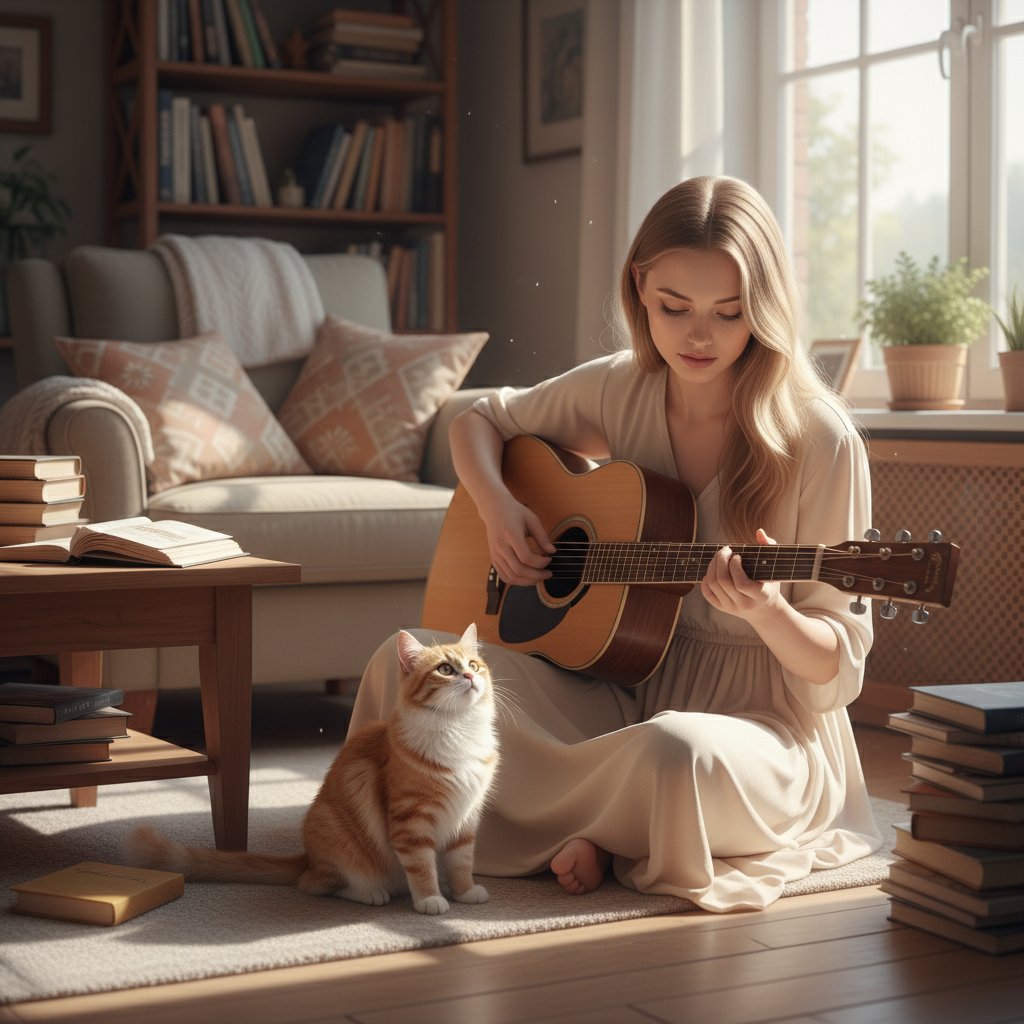 Девушка в легком платье увлеченно играет на акустической гитаре. Пушистый кот сидит у ее ног на ковре и с интересом слушает мелодию. Комната наполнена светом утреннего солнца, повсюду видны книги и мягкие диванные подушки, создавая атмосферу уюта.