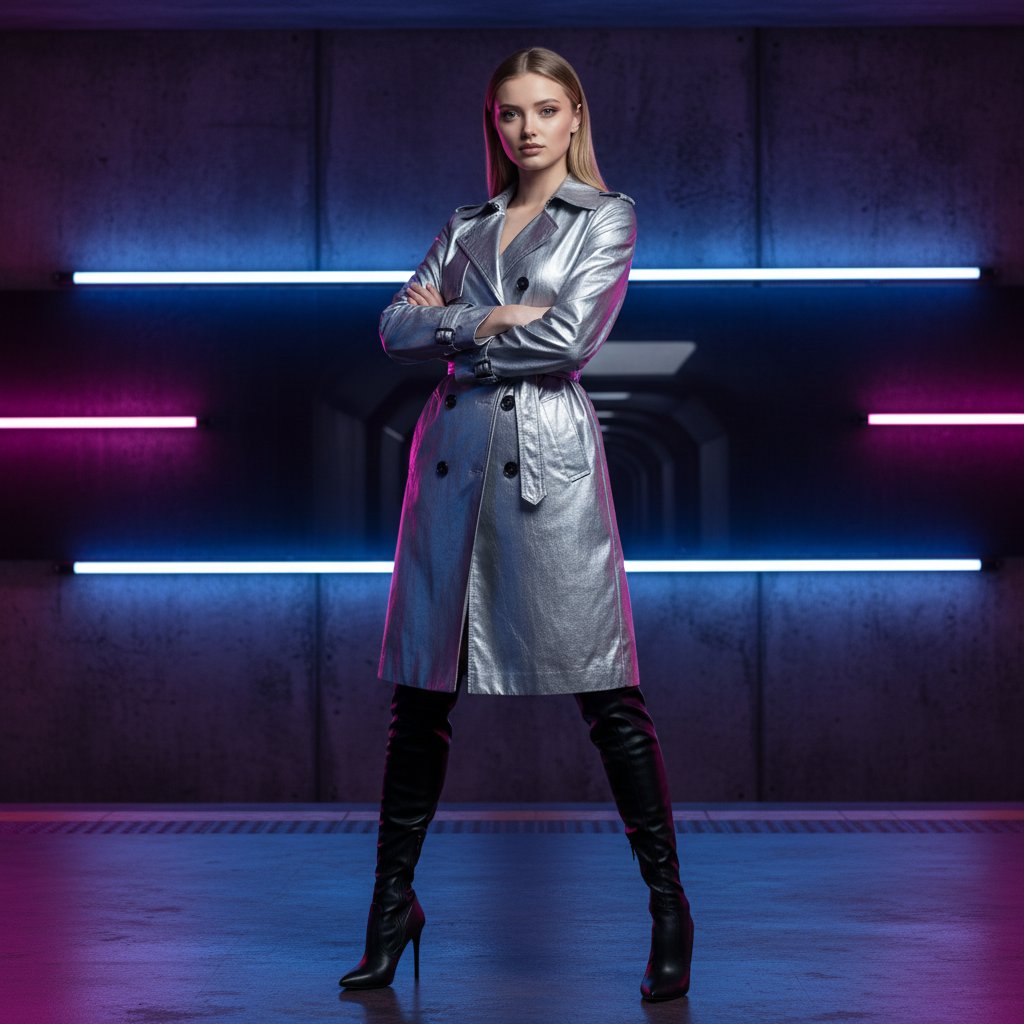 Фотография женщины в серебристом пальто и ботфортах на шпильке, стоящей у стены метро, освещенной неоновыми лампами розового и синего цвета. Руки скрещены на груди, взгляд уверенно направлен в объектив. На заднем плане — пустой тоннель метро. Яркое освещение подчеркивает элегантность образа.
