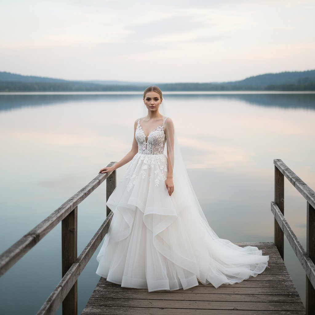 Девушка в свадебном наряде на деревянном помосте у озера. На ней изысканное платье с воздушной юбкой, украшенный вышивкой лиф и длинная полупрозрачная фата. Она стоит, опираясь одной рукой на поручень, и смотрит в объектив. Вокруг — водная гладь и отражение неба, создающее умиротворенную атмосферу.