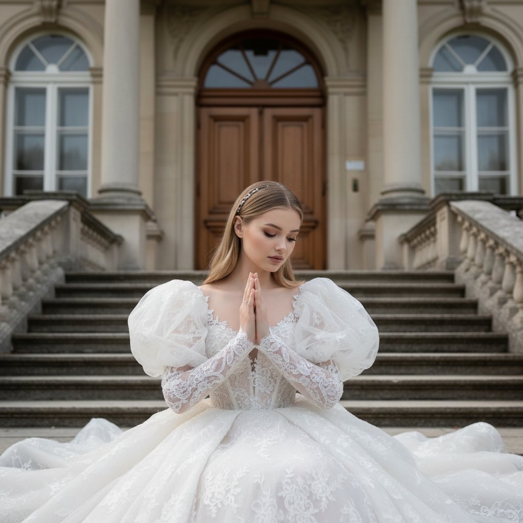 Молодая женщина в свадебном наряде с пышными рукавами расположилась на ступенях величественного поместья. Ее руки сложены в молитве, а взгляд устремлен вниз. На заднем плане видны детализированные двери и высокие окна. Мягкий естественный свет подчеркивает ее меланхоличное настроение.
