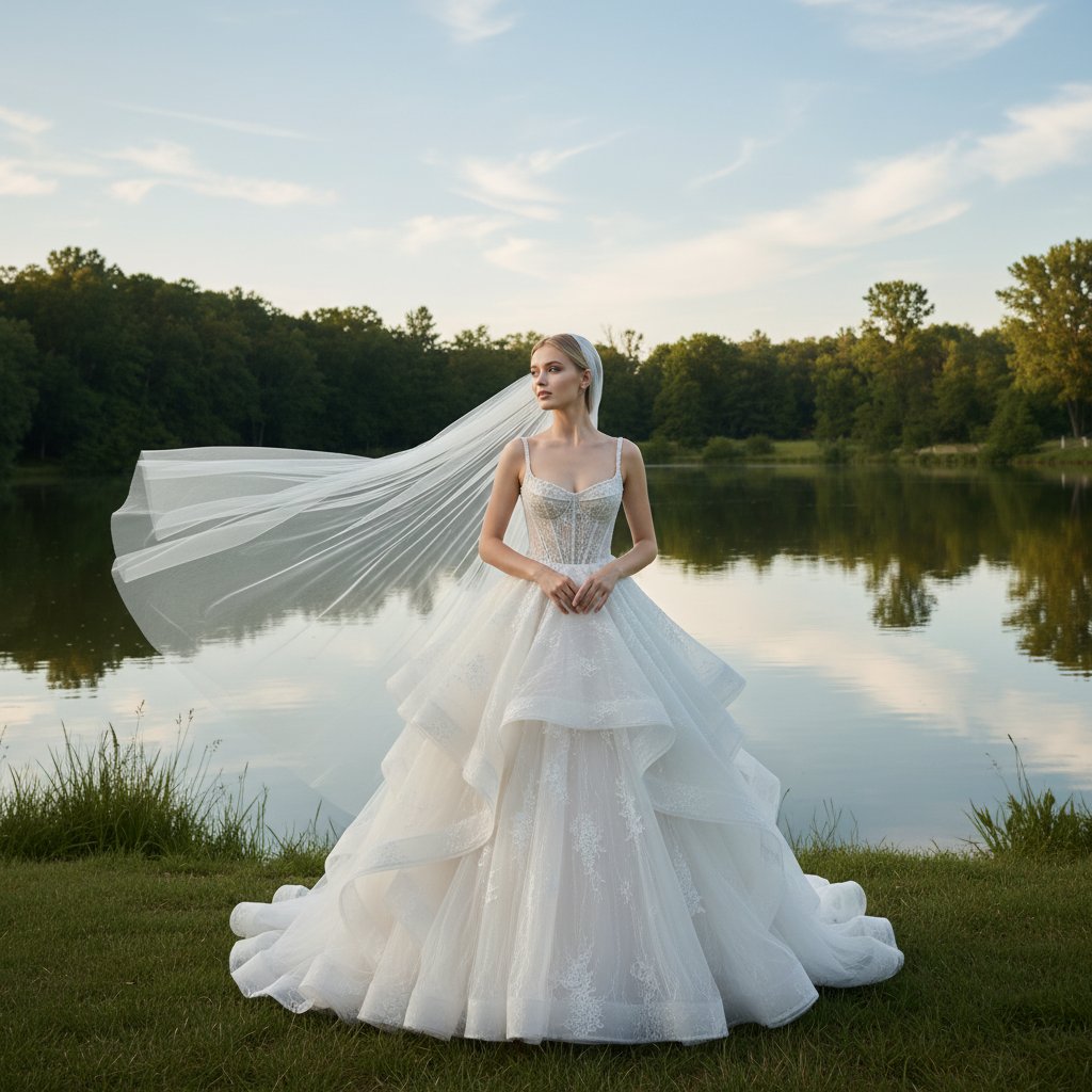 Девушка в свадебном наряде с пышной юбкой и корсетом позирует у водоема. Легкая фата развевается на ветру, руки сложены на груди. На заднем плане видны деревья и небо, отражающиеся в воде. Мягкое освещение подчеркивает естественную красоту момента.