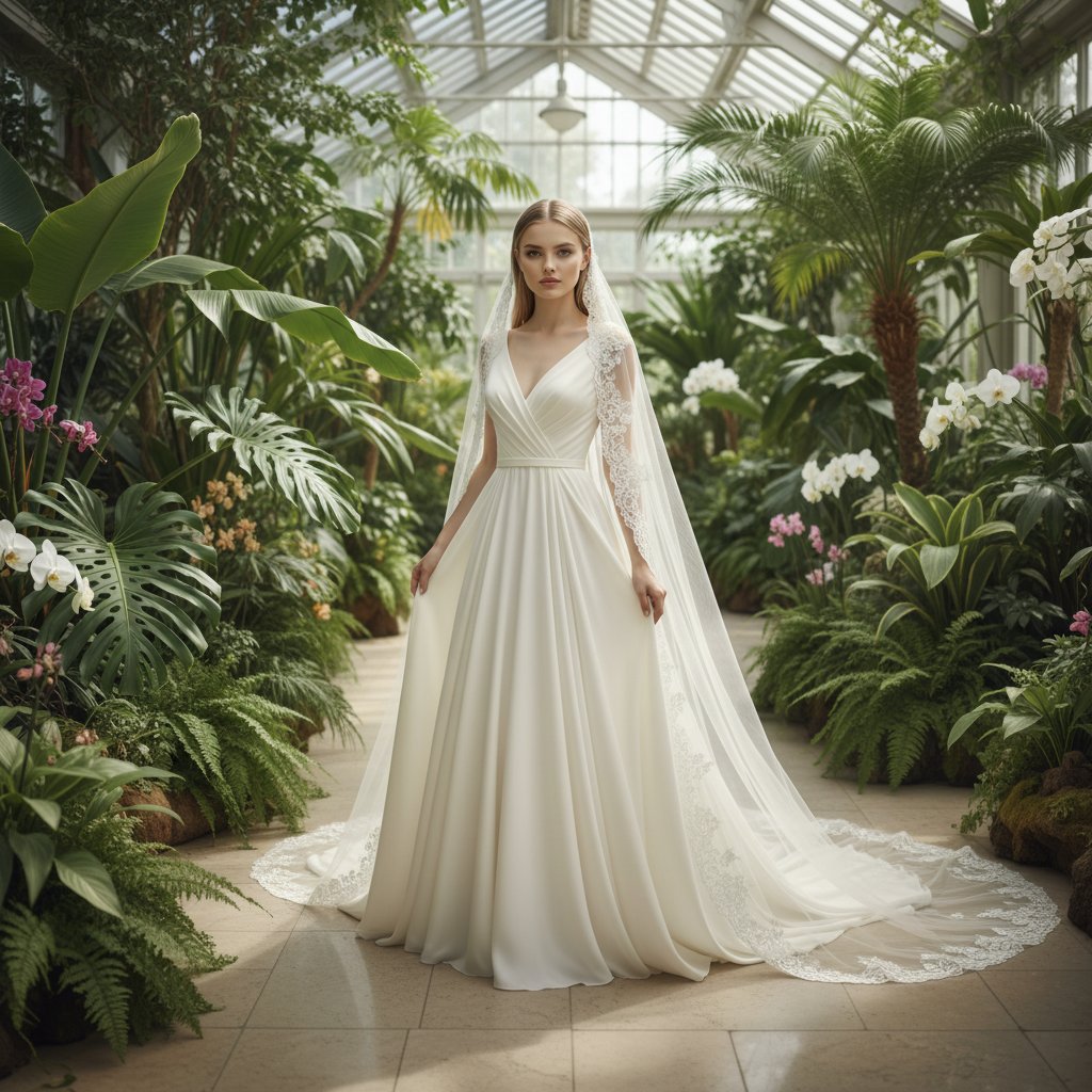 Нежный образ невесты в струящемся свадебном платье А-силуэта с длинной фатой, расшитой изящным кружевом, среди пышной зелени тропических растений в просторной оранжерее. Девушка стоит, обратив взгляд в объектив, и деликатно придерживает руками подол платья. Мягкий, рассеянный дневной свет окутывает сцену, подчеркивая свежесть и красоту момента.