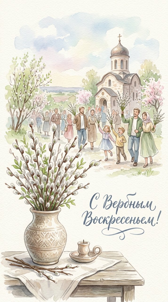 NanoBanana 2Нежная иллюстрация в акварельном стиле для открытки к Вербному воскресенью, люди держат веточки вербы или верба в вазе на переднем плане, мягкие размытые мазки, светлая весенняя палитра, пастельные оттенки, ощущение лёгкости и чистоты, мягкий рассеянный свет, художественная композиция с пустым пространством, аккуратная каллиграфическая надпись кириллицей «С Вербным воскресеньем» в негативном пространстве, текст гармонично вписан, бумажная текстура, воздушная атмосфера, высокая детализация