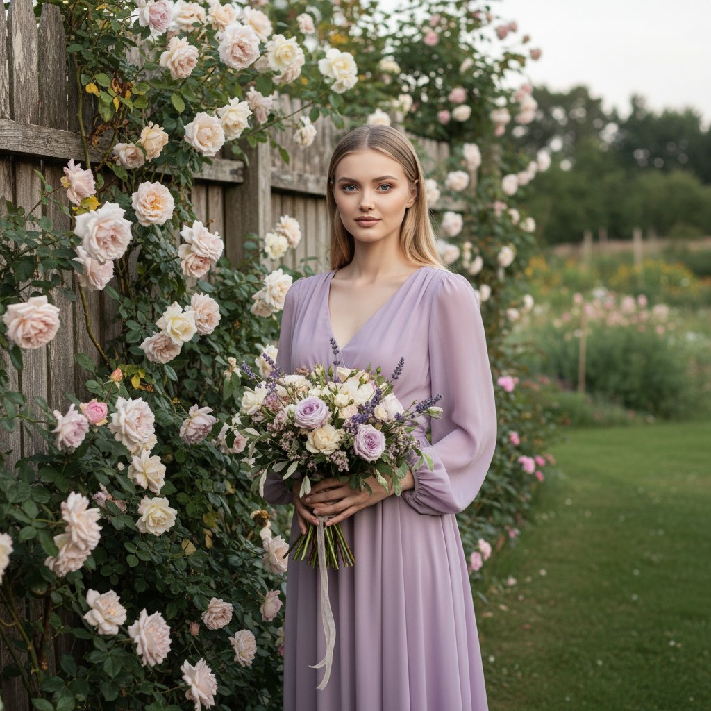 Женский портрет: дама в длинном платье лавандового цвета с рукавами. Она стоит у старого деревянного забора, увитого пышными розами. В руках у нее букет цветов, взгляд направлен в объектив, на губах легкая улыбка. На заднем плане раскинулся зеленый сад. Мягкий свет подчеркивает ее утонченность.