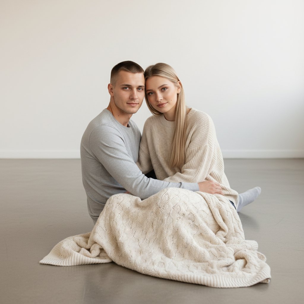Молодая пара, сидящая на полу в минималистичной светлой студии, рядом с мягким пледом. Они смотрят прямо в камеру, их взгляды полны нежности. Освещение приглушенное, фон простой, создавая атмосферу умиротворения и гармонии.