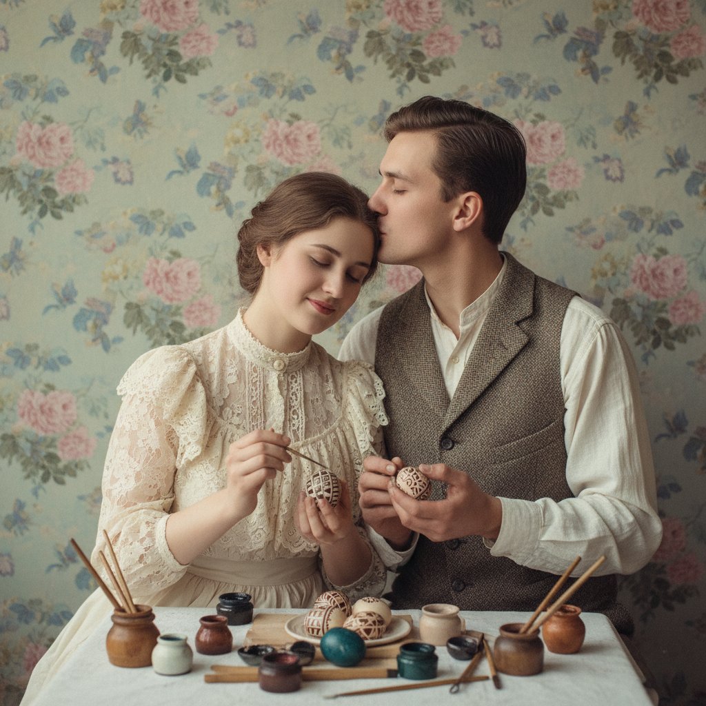 Винтажная православная пасхальная открытка без текста, красивая молодая пара сидит рядом, раскрашивая традиционные пасхальные яйца, мужчина нежно целует девушку в лоб, винтажные цветочные обои на заднем плане, эстетика мягкой пленочной фотографии, приглушенная пастельная цветовая палитра, романтическая ностальгическая атмосфера, стиль Pinterest, очень детальная проработка --ar 3:4