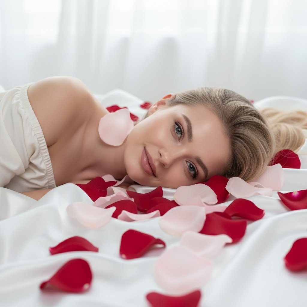 Девушка расслабленно лежит на белоснежной ткани, окруженная алыми и нежно-розовыми лепестками роз. Ее взгляд направлен в объектив, на лице — легкая, умиротворенная улыбка. На заднем плане — светлое пространство с воздушными шторами. Съемка крупным планом, подчеркивающая искренность и романтическое настроение.