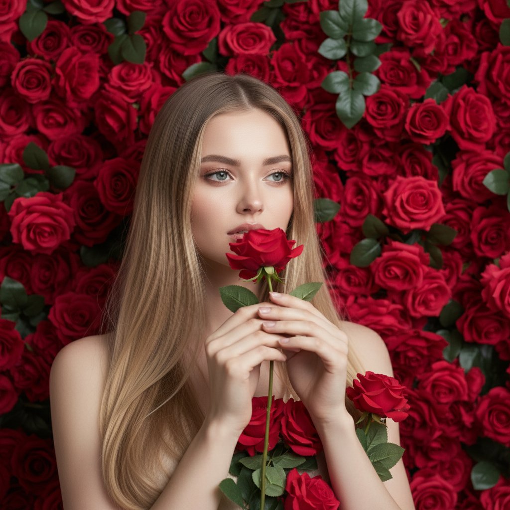 Портрет женщины на фоне стены, увитой алыми розами. В её руках — раскрывающийся бутон, который она подносит к губам. Взгляд полон томной загадочности. Акцент на крупный план, передающий чувственность и глубину красного цвета.