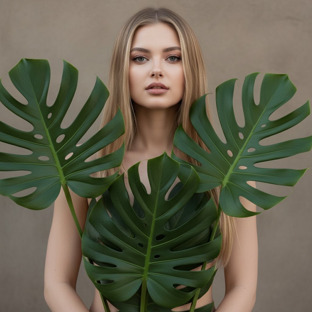 Женщина у стены, тело частично прикрыто крупными листьями монстеры, акцентирующими грудь и бедра. Взгляд уверенный, направлен прямо в объектив. Крупный план, передающий атмосферу экзотической утонченности.